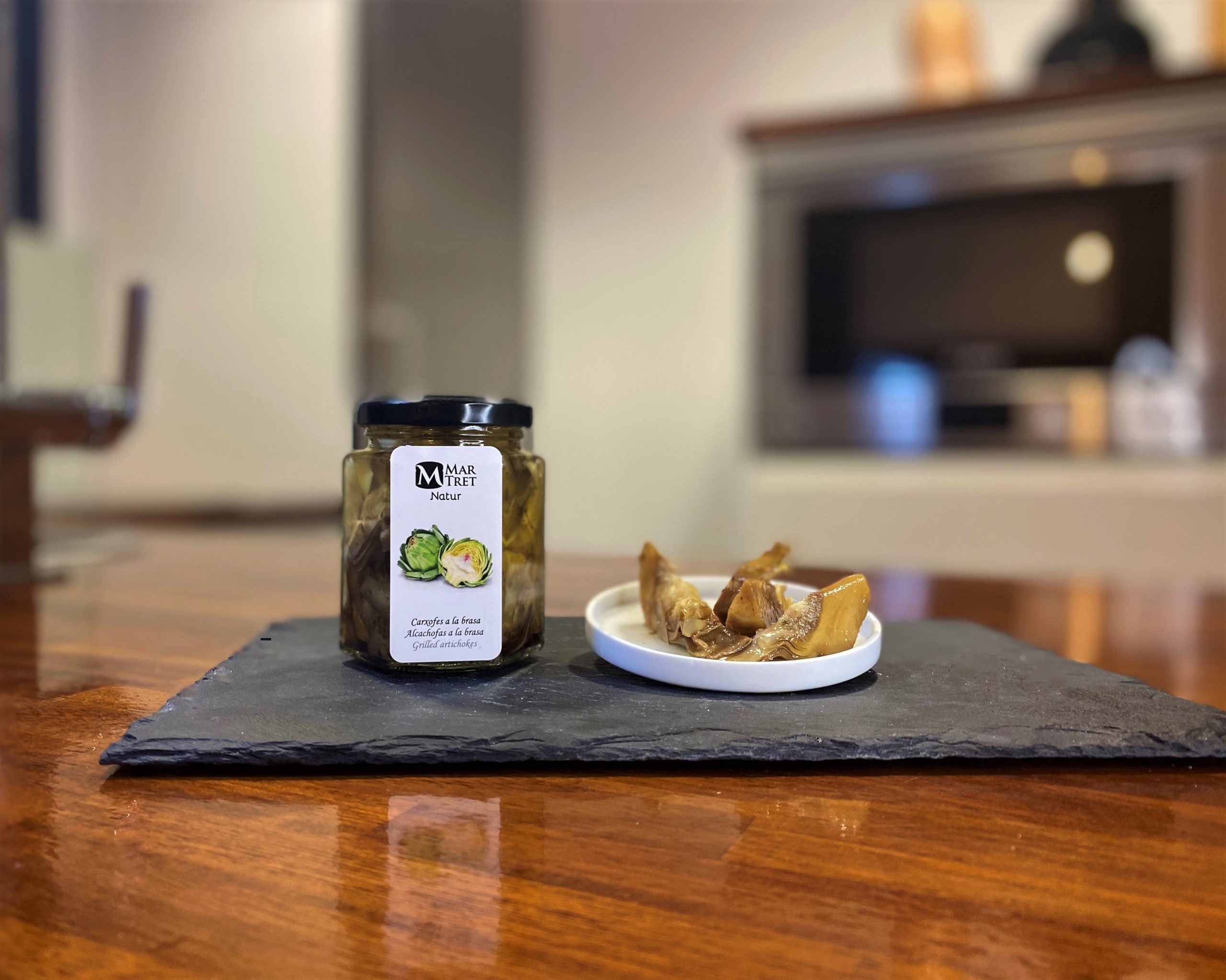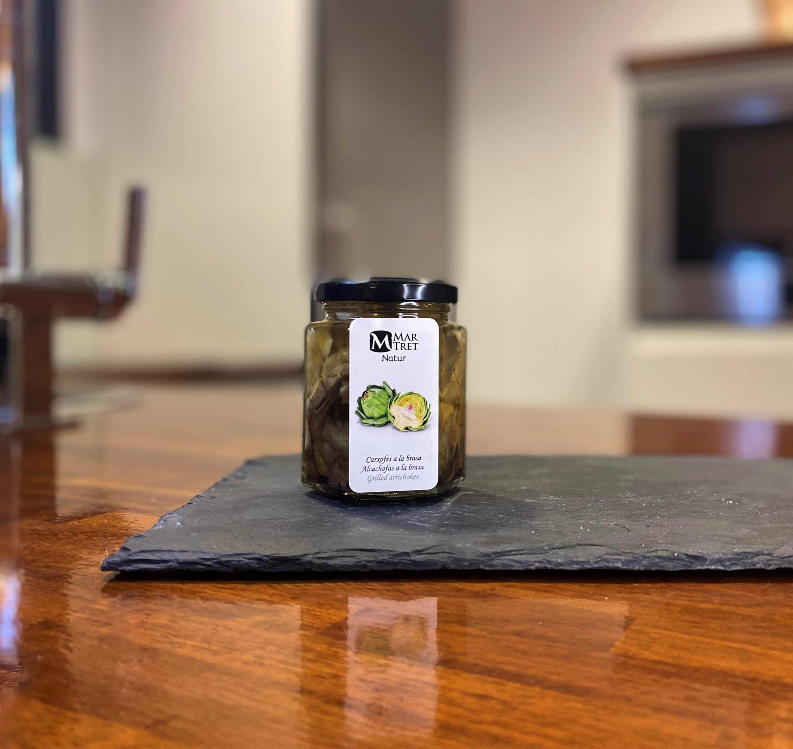 Las alcachofas se limpian y se cuecen a la brasa muy suave. Se introducen en los tarros de cristal con vinagre de Módena, y hierbas aromáticas dejándolas macerar
